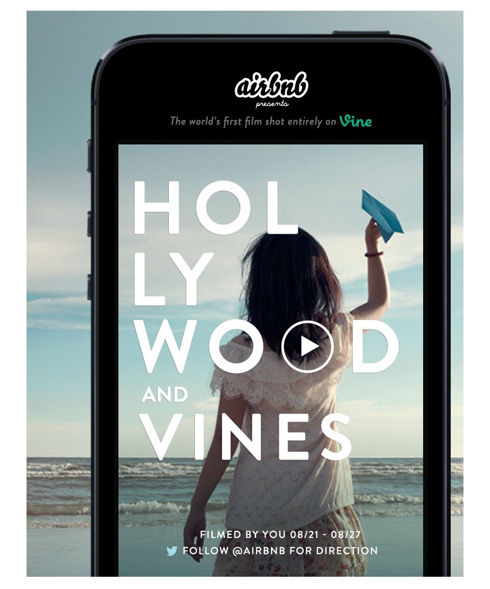 Airbnb is a pioneer of social innovation, creating new ways for people to travel, explore and share resources by connecting online. Hollywood & Vines is a first-of-its-kind short film directed via Twitter and shot entirely on Vine. Airbnb itself is never mentioned, and yet the film uniquely captures the principles that make the company special. We created the transformative journey of a simple piece of paper - from being bored to traveling the world, coming home and inspiring other pieces of paper to do the same - - the story of Airbnb. Over a 5 day period, submissions came in from all over the world, from Kansas to Kuwait and everywhere in between. In the end, we used over 100 videos to create a film that embodies the Airbnb mission and tells a touching story of travel, adventure, and finding your place in the world.
